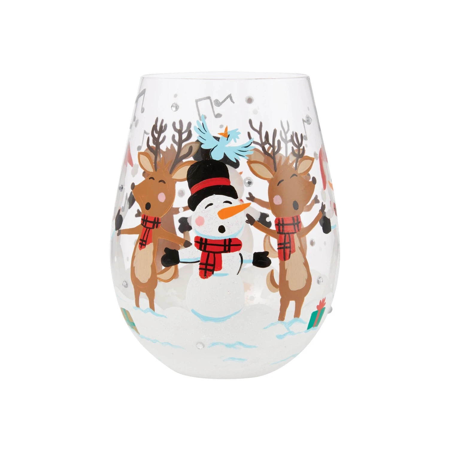 This cheerful stemless wine glass from Lolita shares a scene of Christmas spirit. In matching red plaid scarves, snowmen and reindeer stand together in song. Caroling with gusto and grace, the rosy cheeked troupe sing amongst crystal snowflakes.