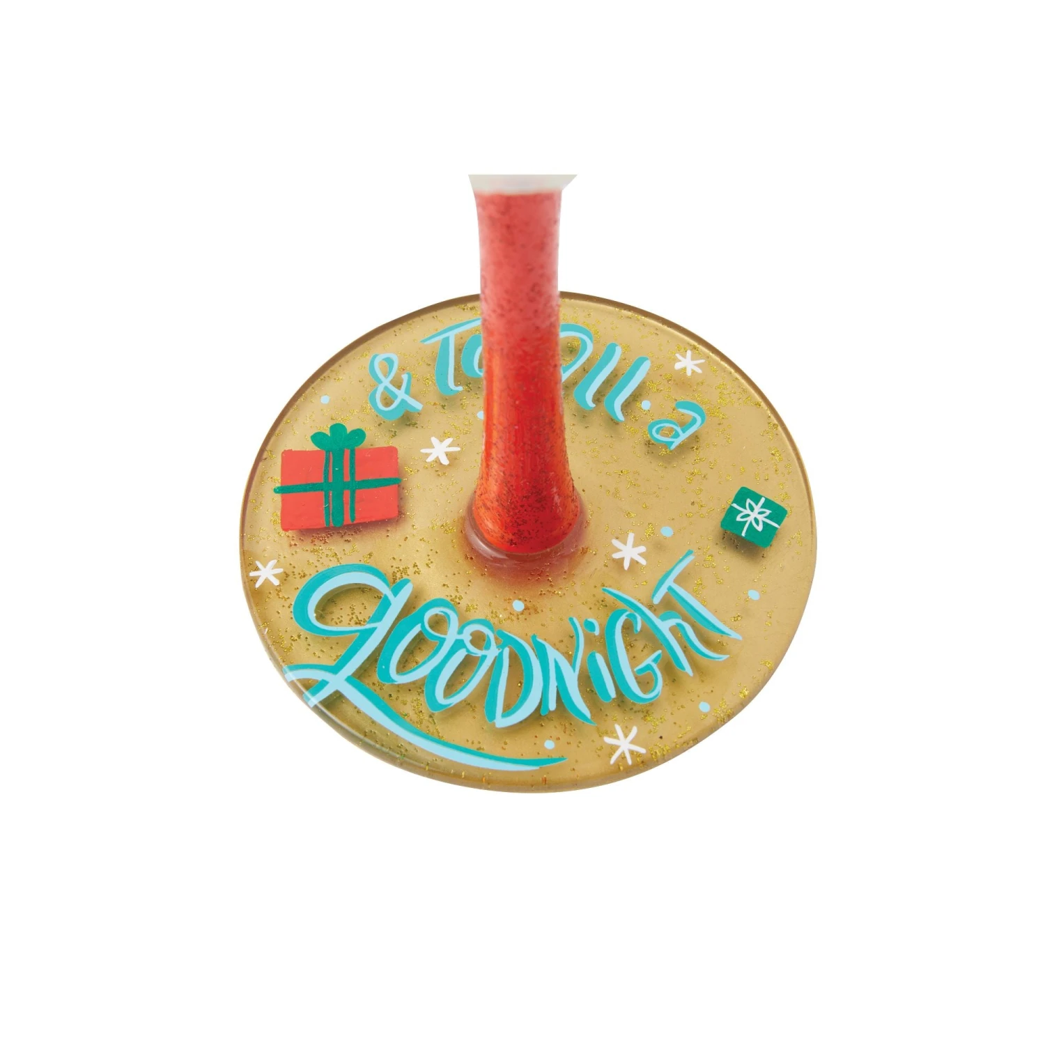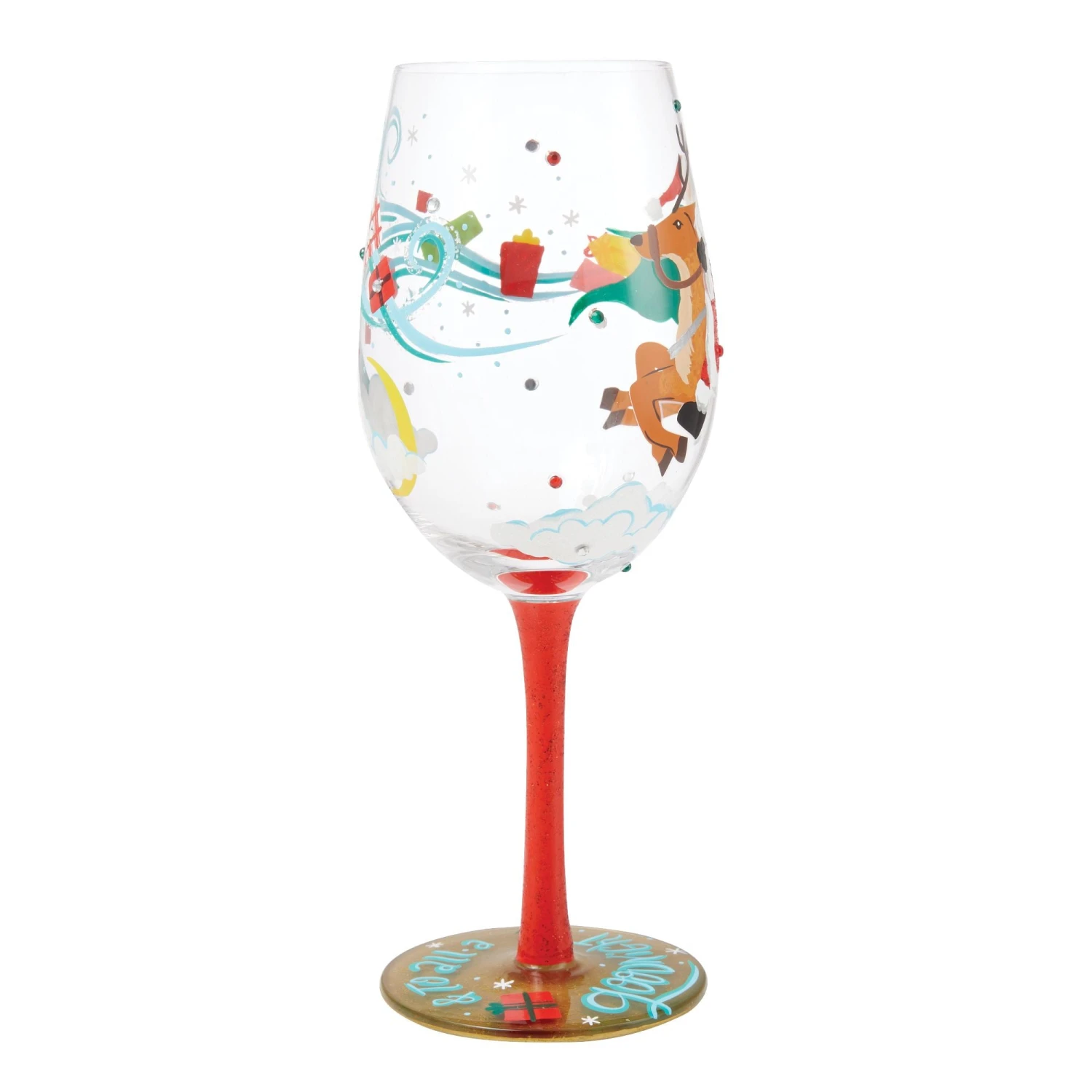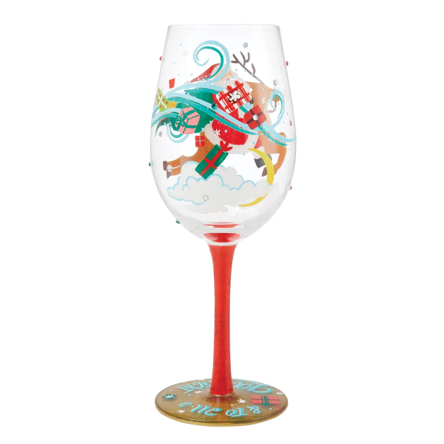 This lovely hand-painted wine glass from Lolita features father Christmas riding a reindeer through the winter skies. With blue gusts of wind and inlaid red and green crystals, the gorgeous glass wishes all a good night from its shimmering gold base.