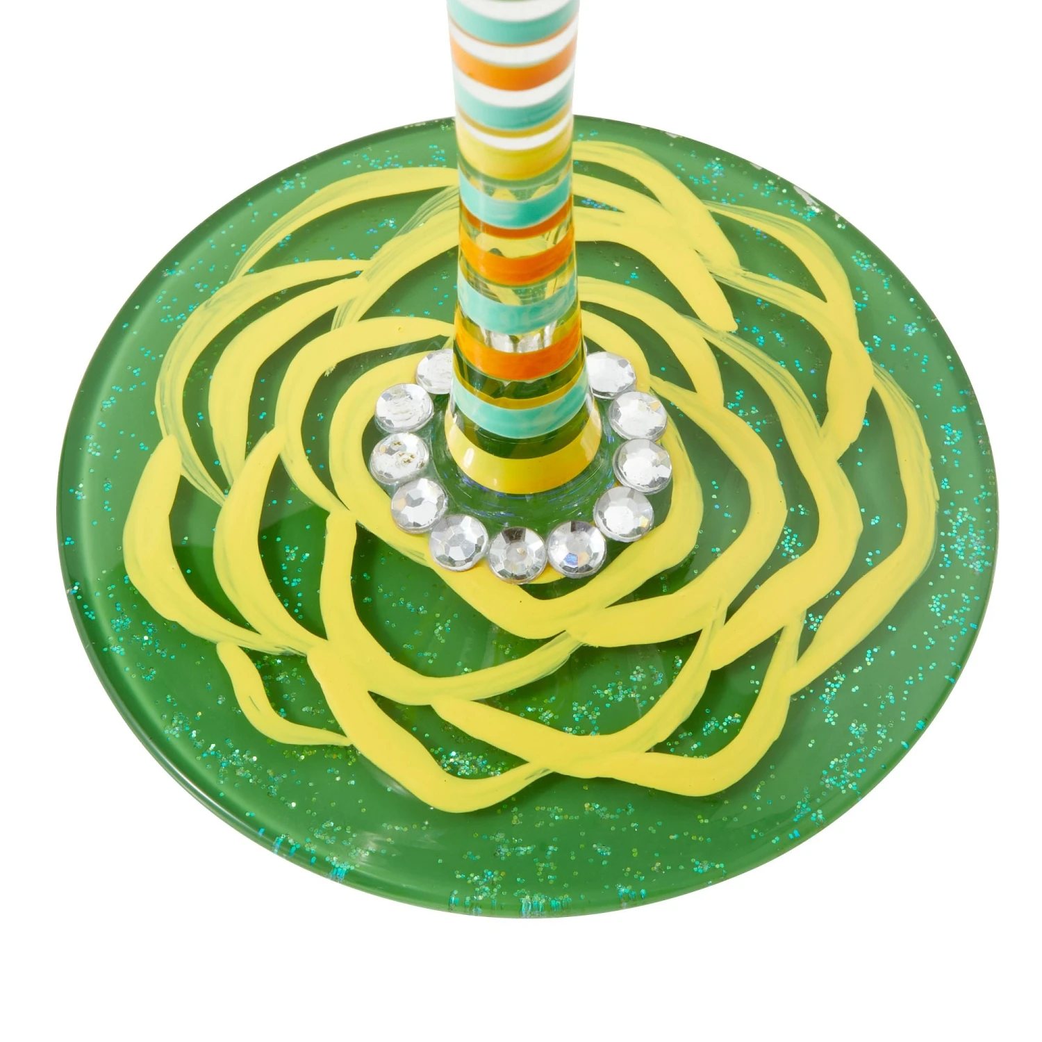 This colorful hand-painted Lolita wine glass was specially crafted for best friends. Covered in saturated yellow and white flowers, this glass features glitter and bedazzled crystals. A bee pollinates the goblet garden with a sweet message.