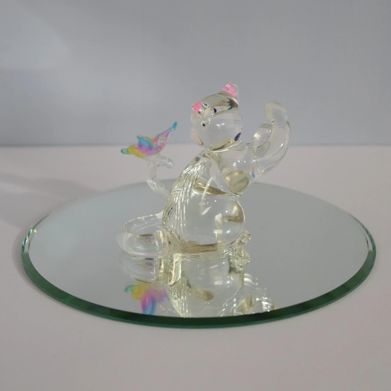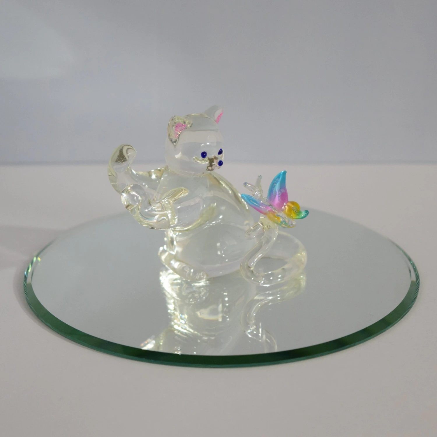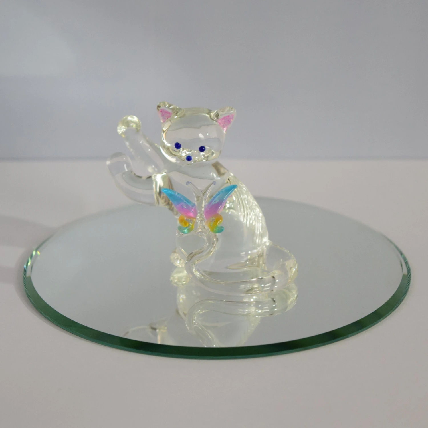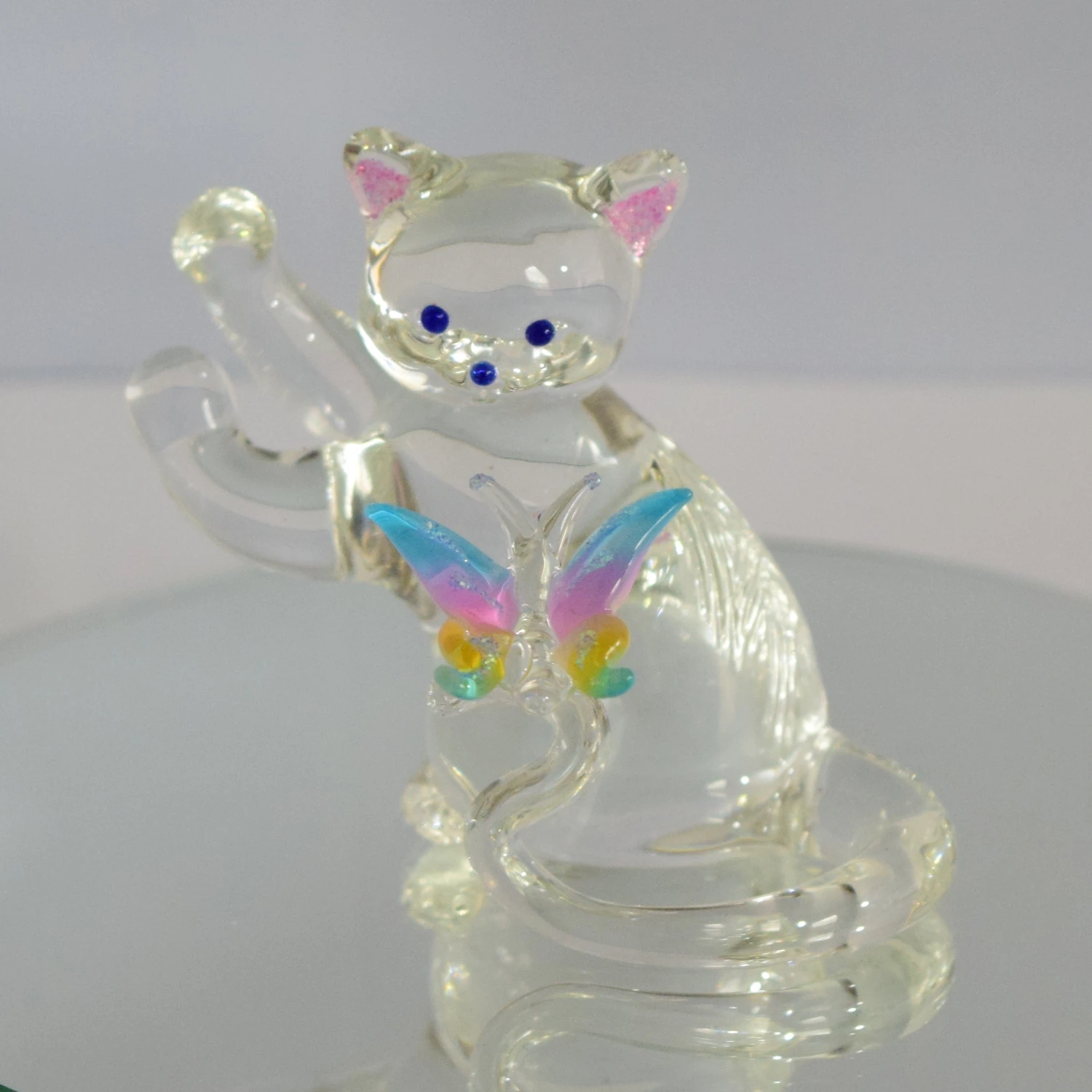Do you or someone you know enjoy the great outdoors and all the animals? Well this is the perfect gift for them. This beautifully hand crafted glass sitting cat with a rainbow ombre butterfly will always shine! Hand Blown by our very own glassblower! Add this piece to your collection today! (Mirror not included, sold separately)