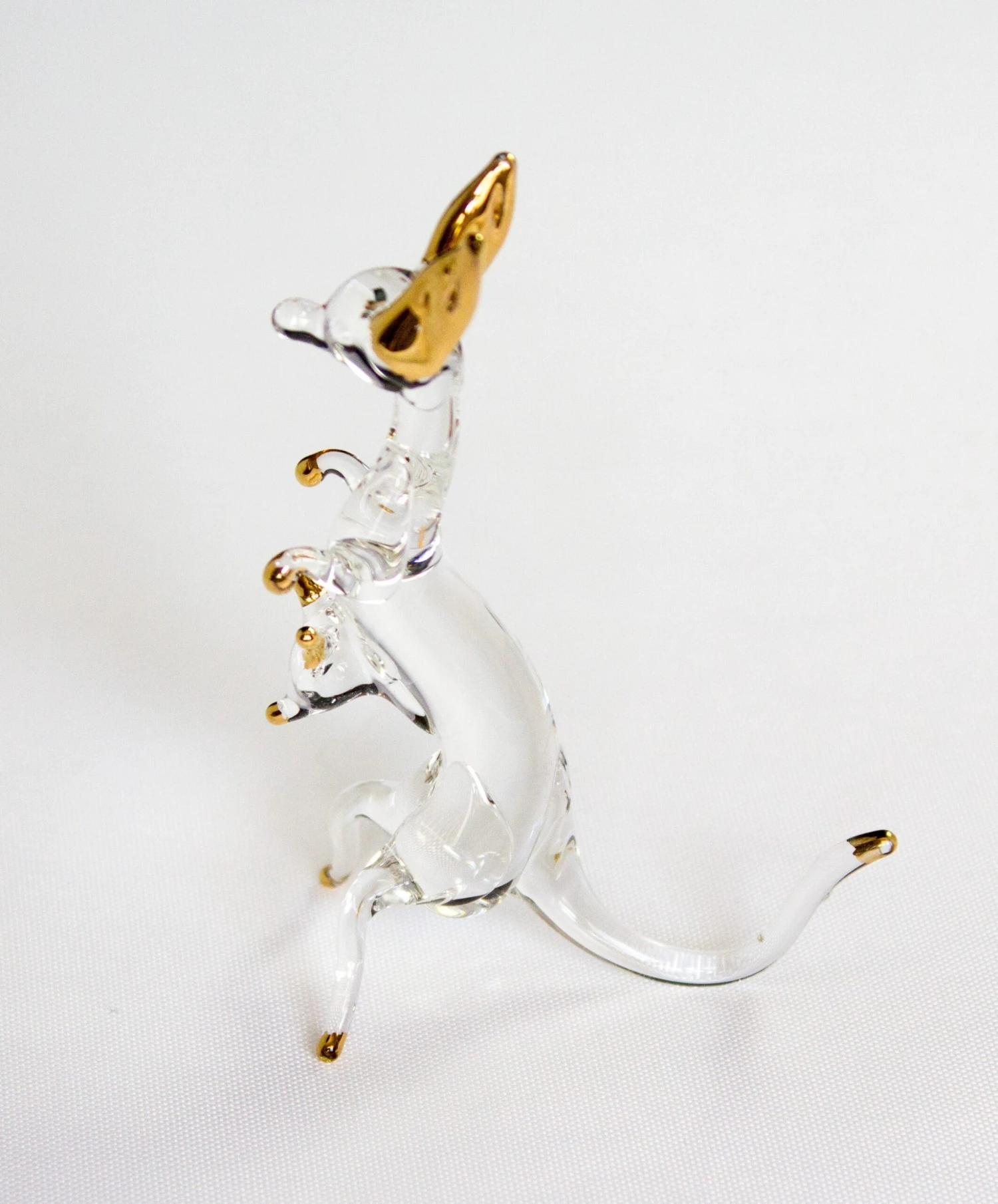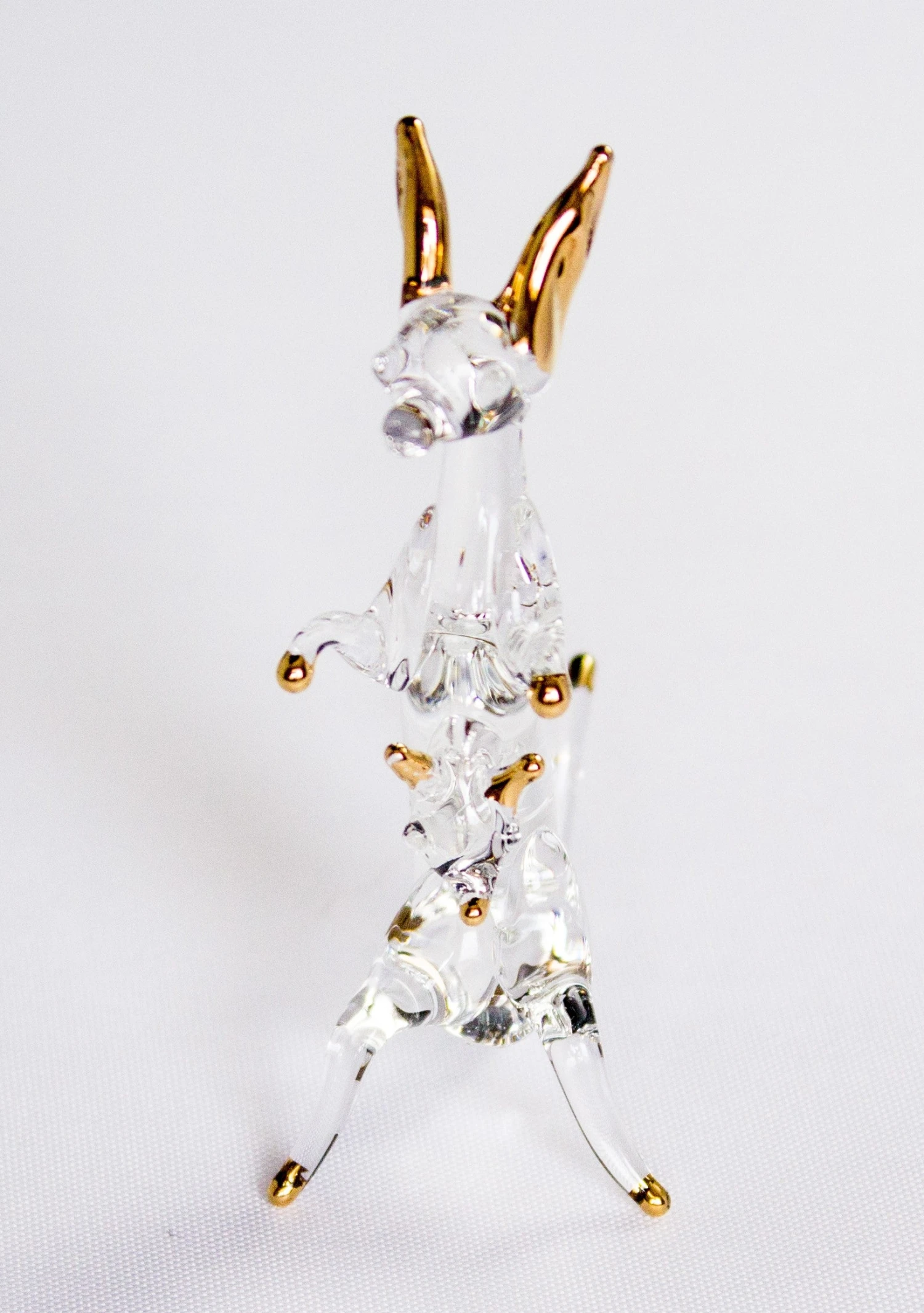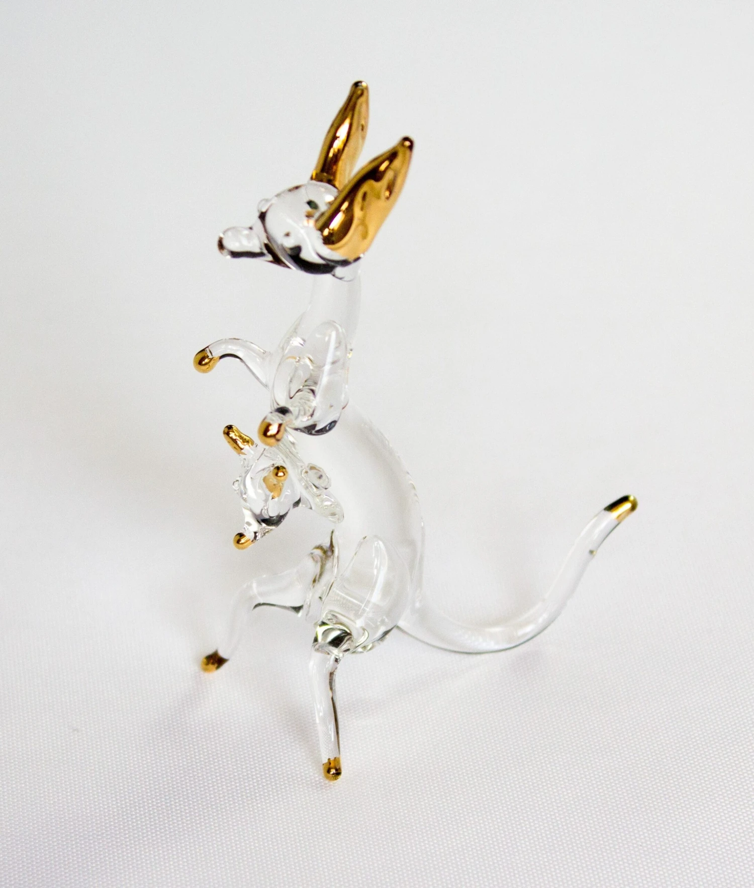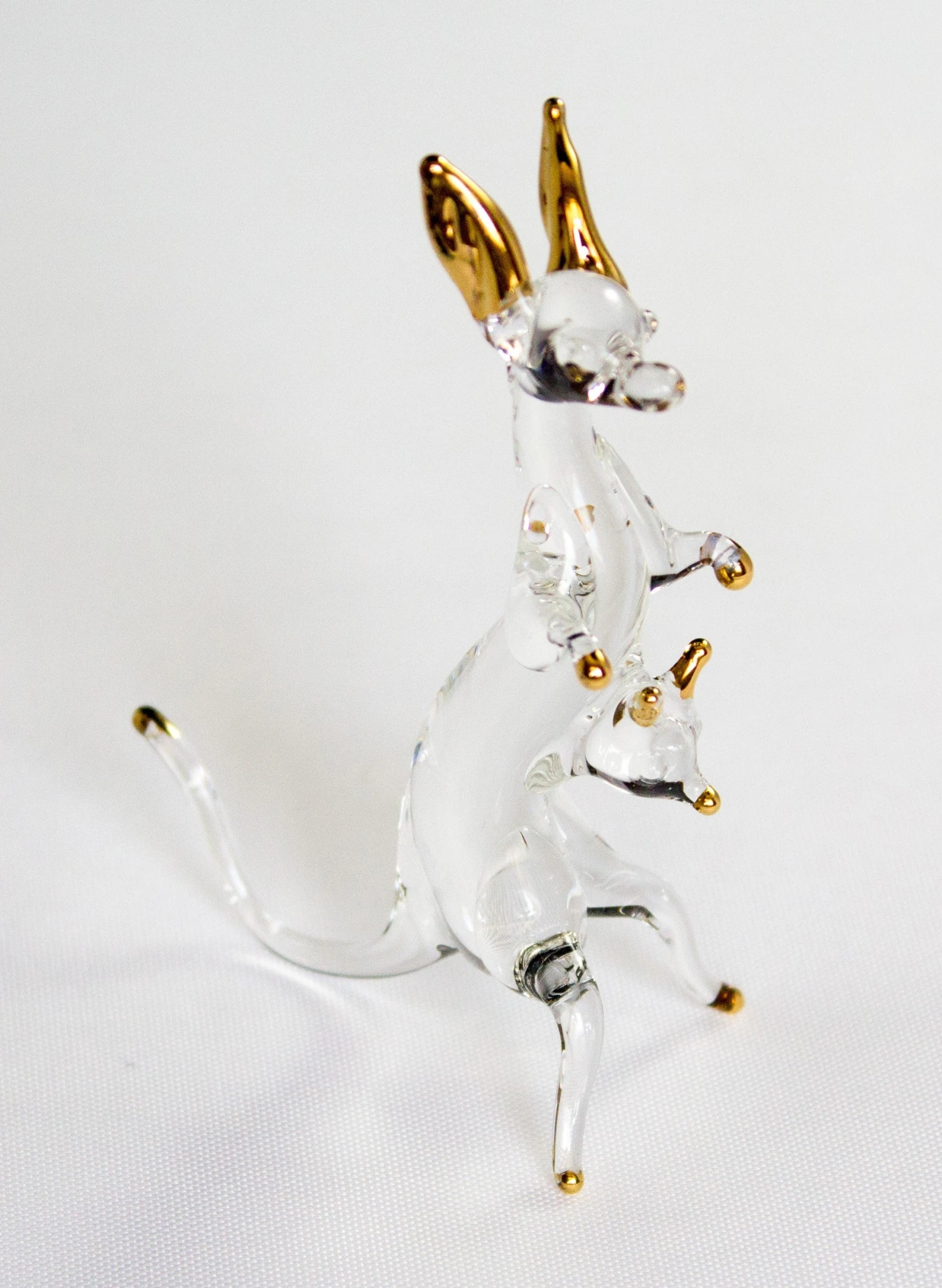 Choose one or both of these figurines to enjoy beautiful Australian wildlife with these clear glass Kangaroos, one with a baby in her pouch. Finished with 22k gold in Manitou Springs, Colorado, this family of Roo’s fill your mind with adventure.