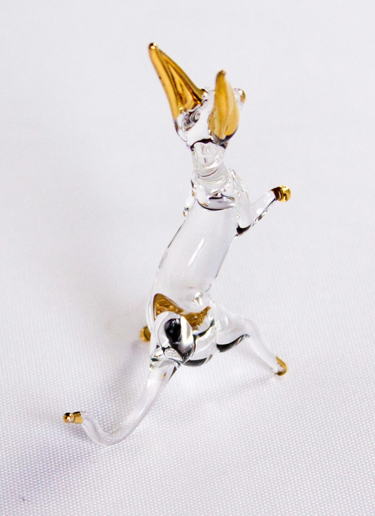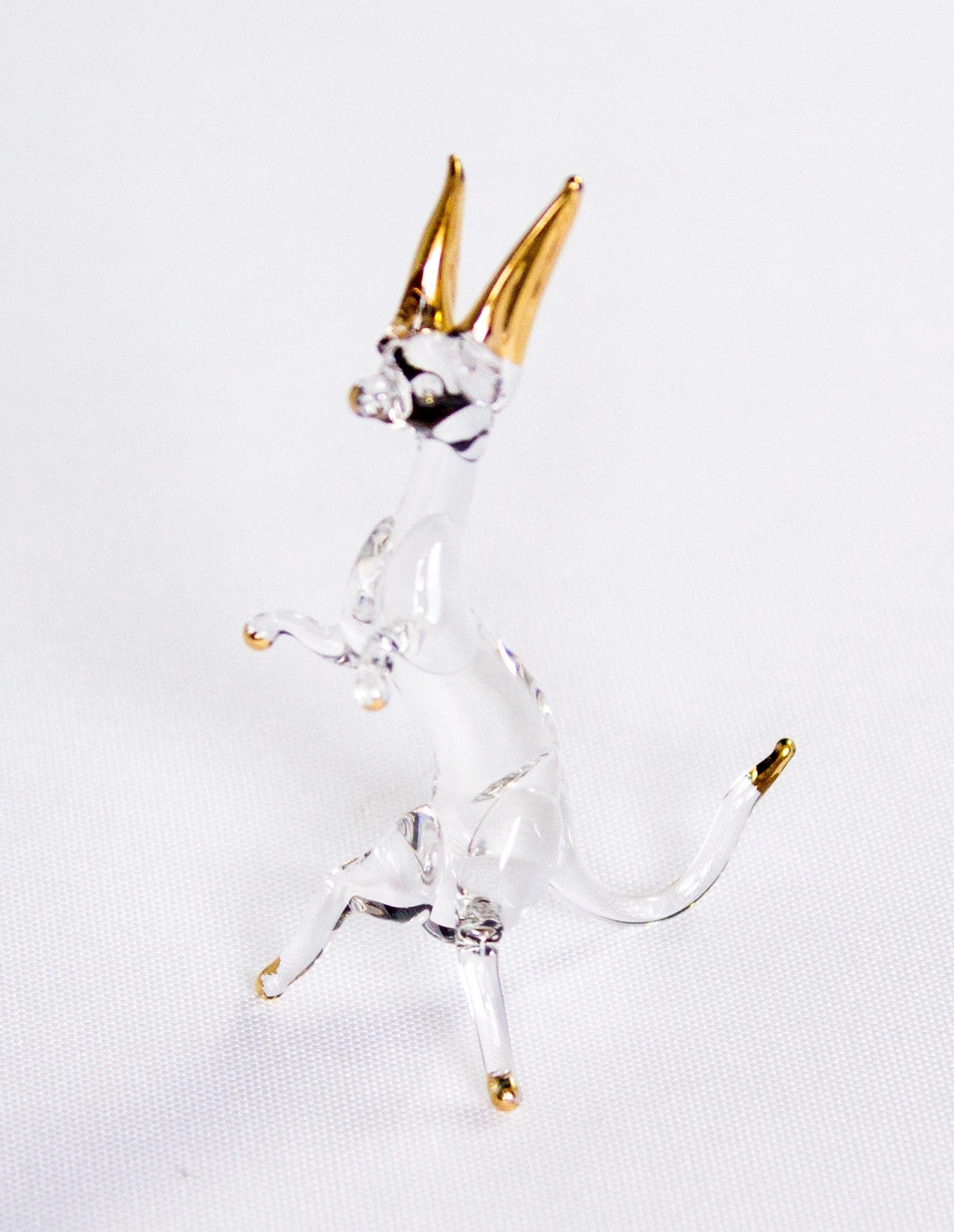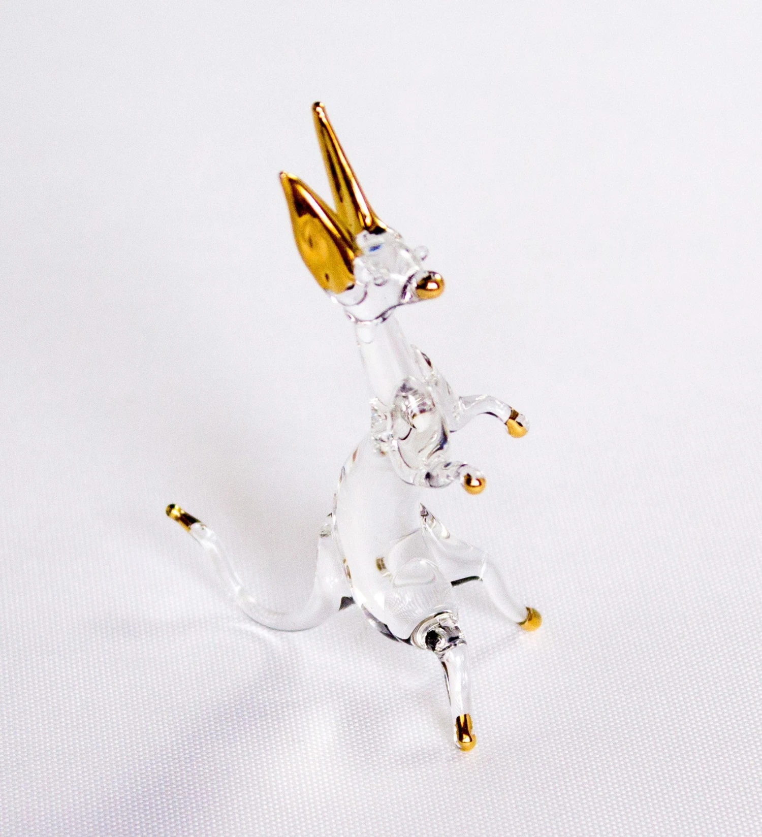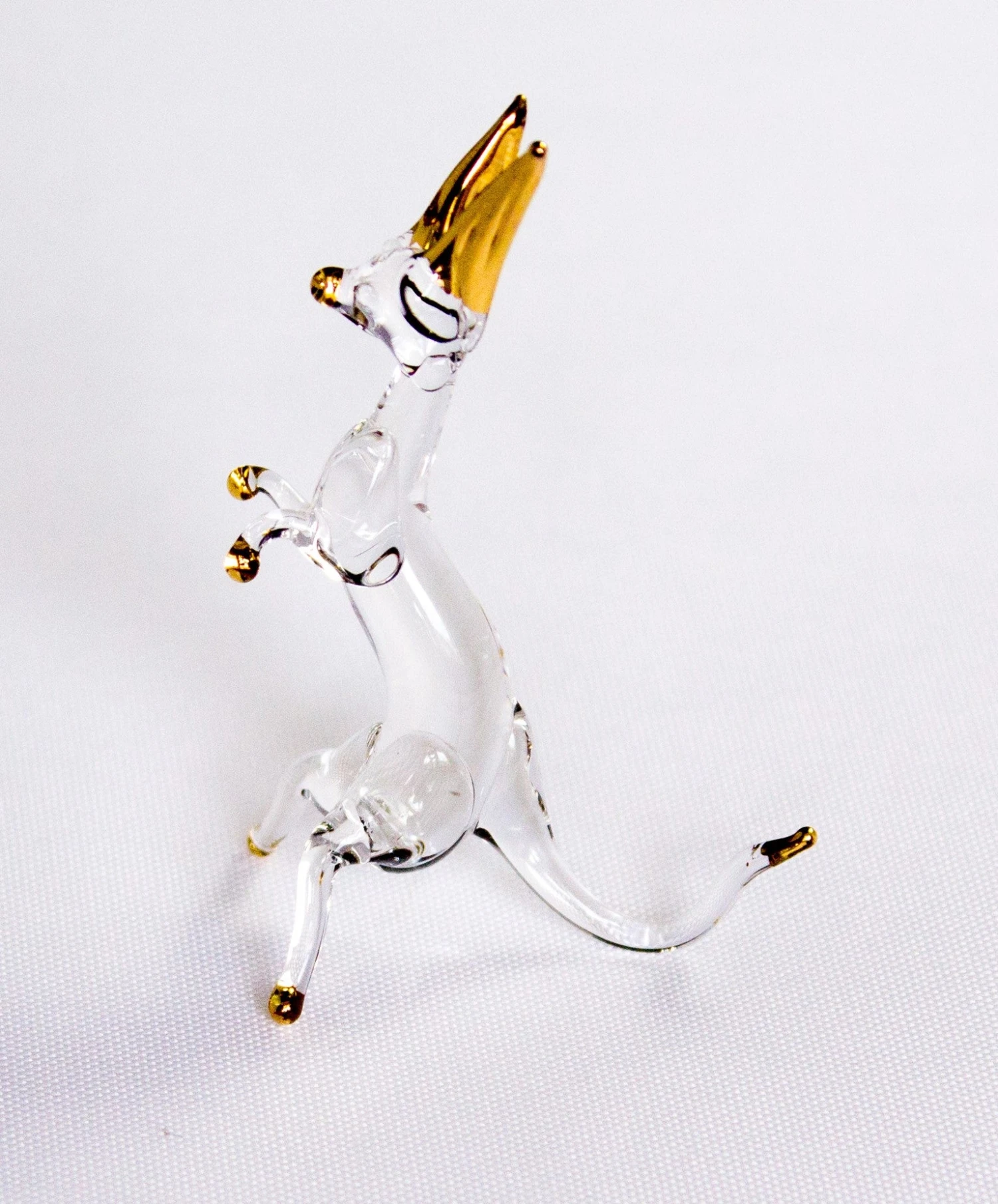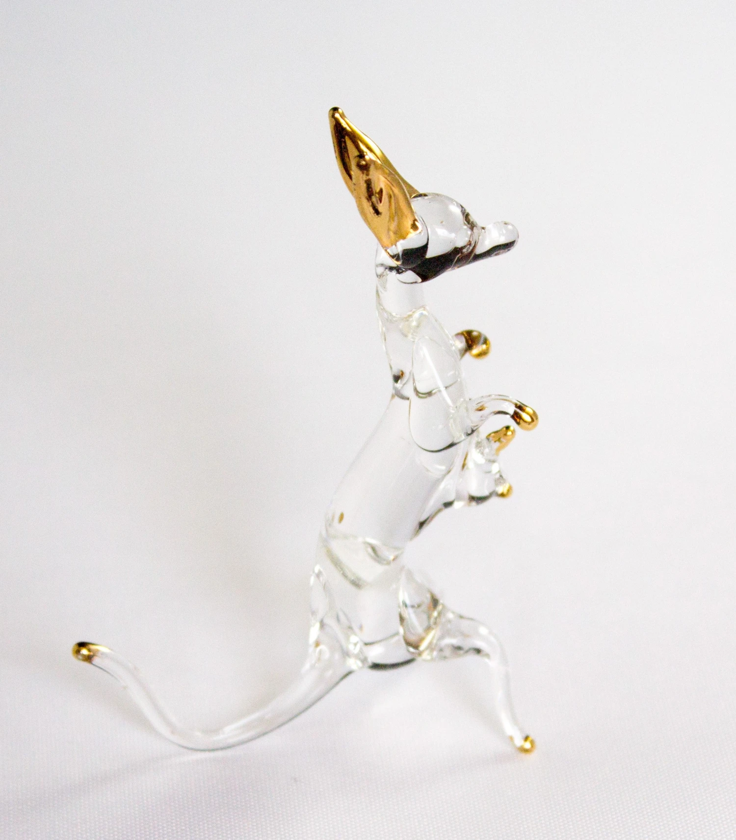 Choose one or both of these figurines to enjoy beautiful Australian wildlife with these clear glass Kangaroos, one with a baby in her pouch. Finished with 22k gold in Manitou Springs, Colorado, this family of Roo’s fill your mind with adventure.