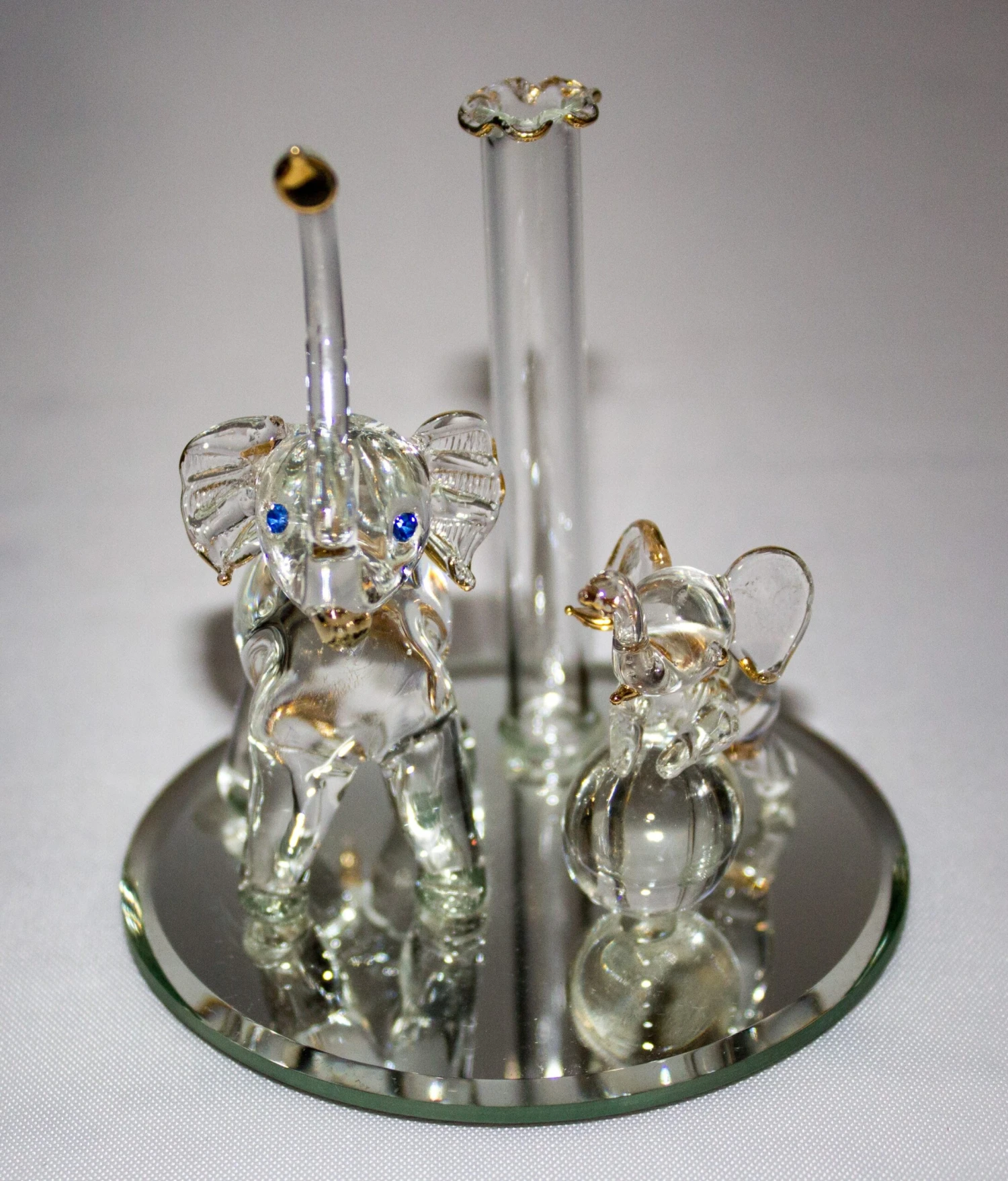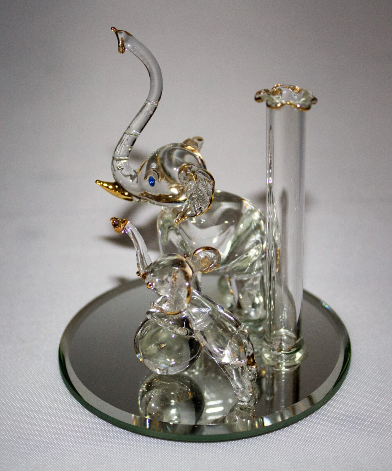 This elegant handmade blown glass elephant figurine has an adult elephant with a playful youngster on a glass ball accompanied by a small single stem vase attached to add a small flower. Finished in Manitou Springs, Colorado with 22K gold plating.
