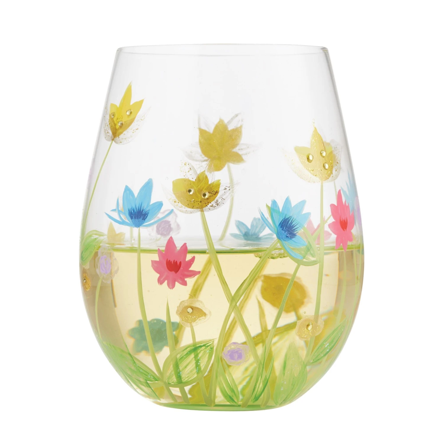 Transport yourself to a field of flowers with this serene sipper from Designs by Lolita. The 20 oz. stemless wine glass is covered in blooms of the meadow. With engrossing color and crystal accents, this flowery cup is a vision from the field of dreams.