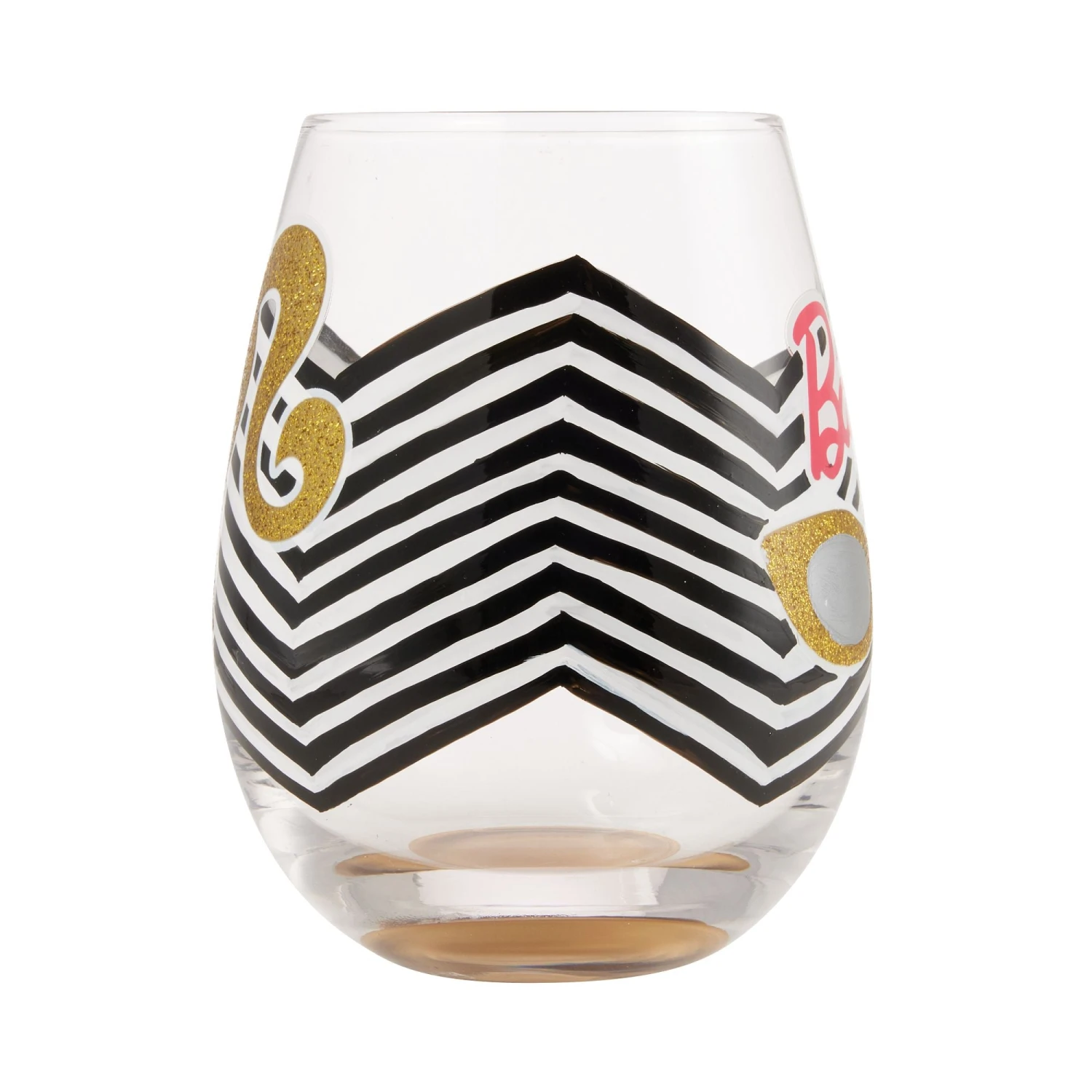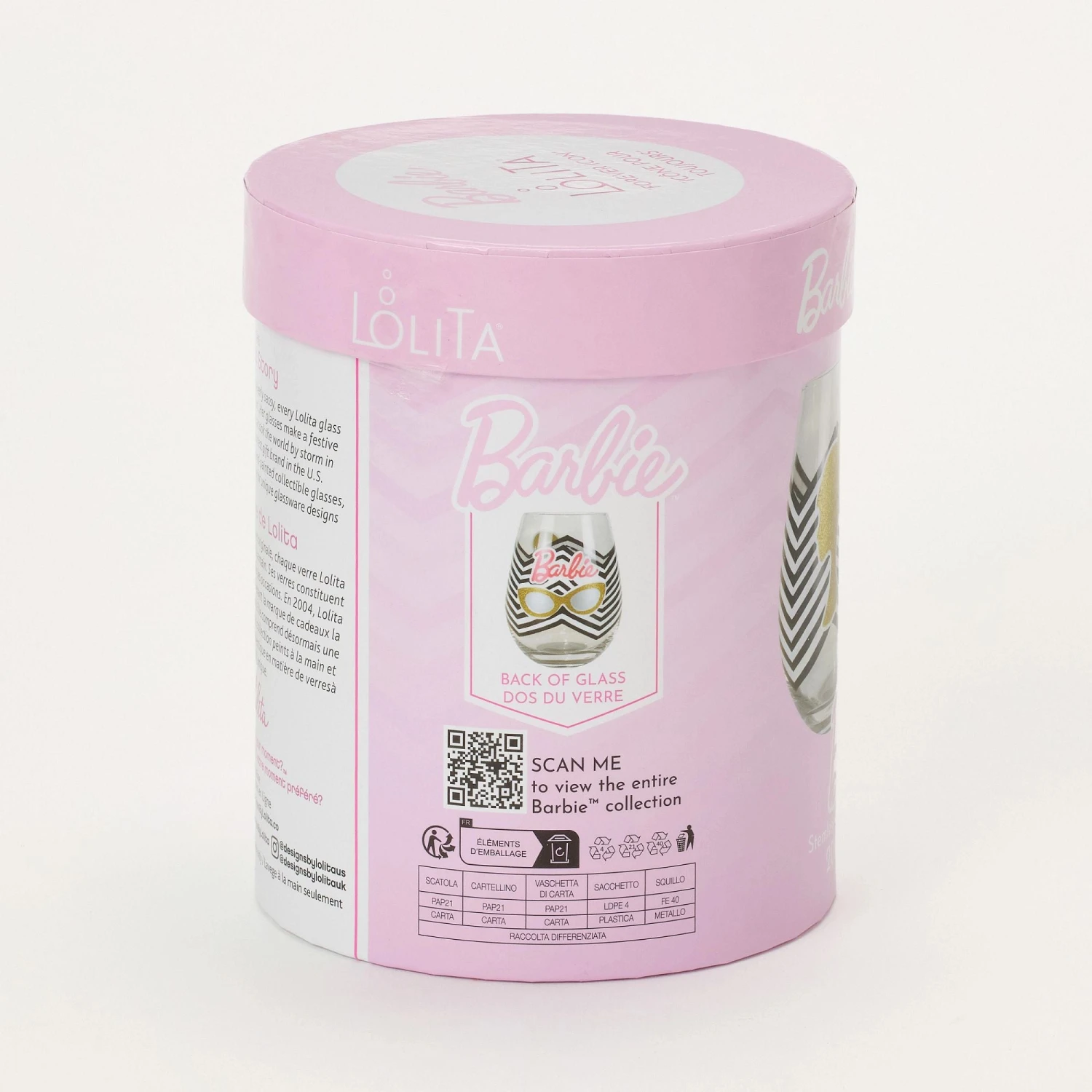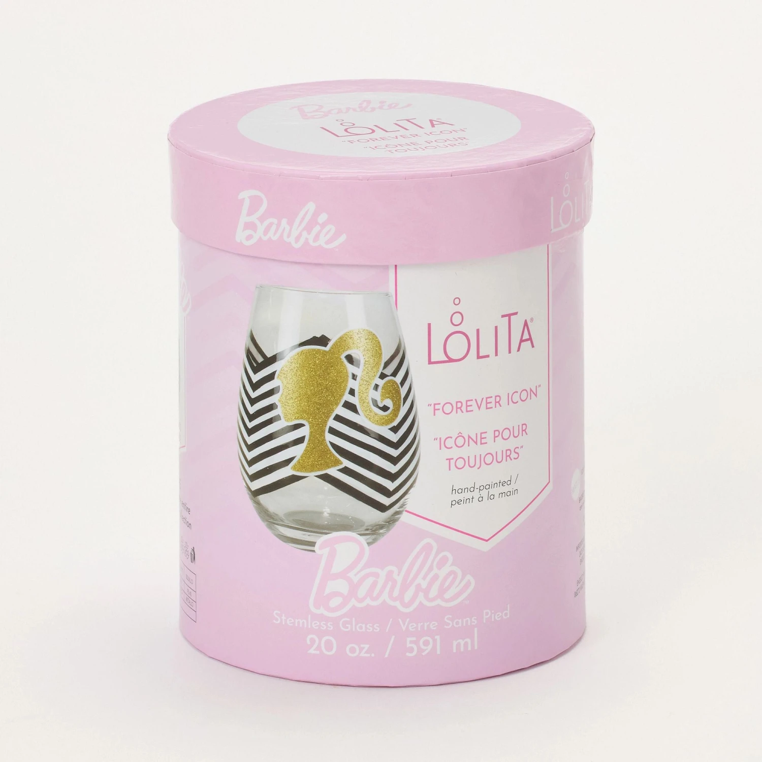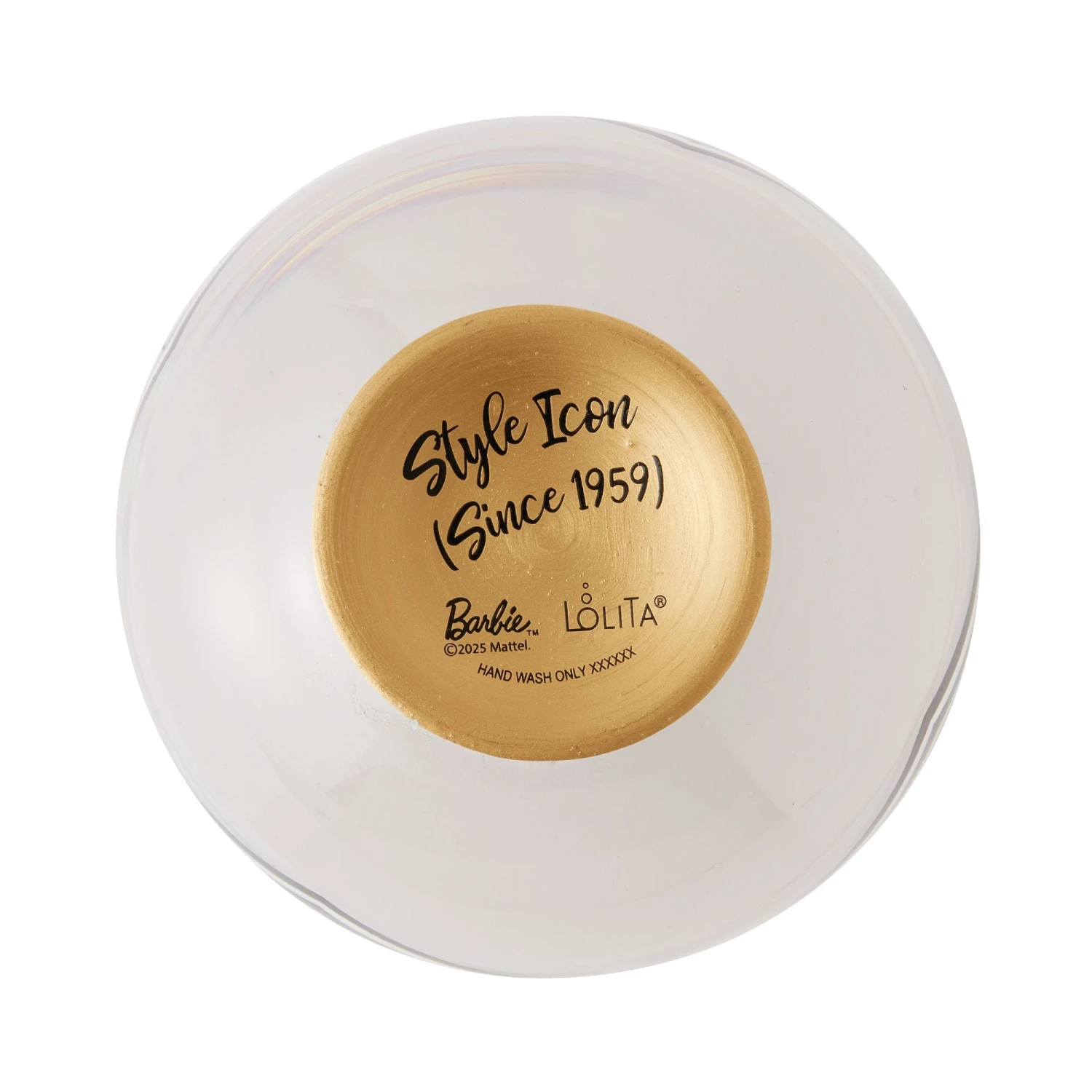 Celebrate the timeless icon, Barbie, with this Lolita glass, featuring her iconic pink logo and shimmering gold-painted silhouette. A stylish chevron pattern adds flair, while gold-rimmed glasses complete the chic look.