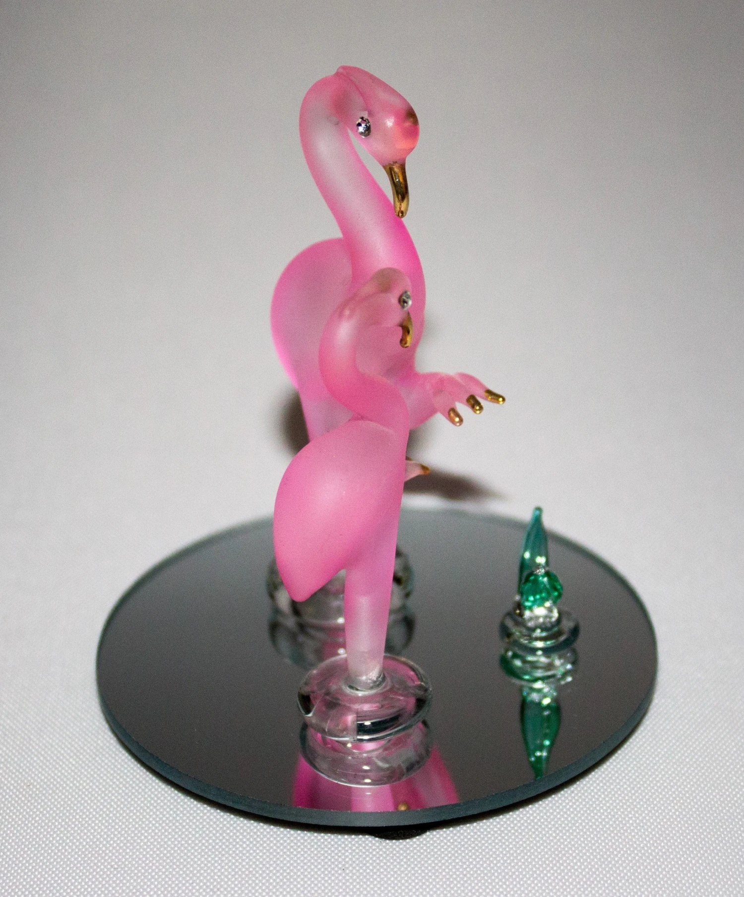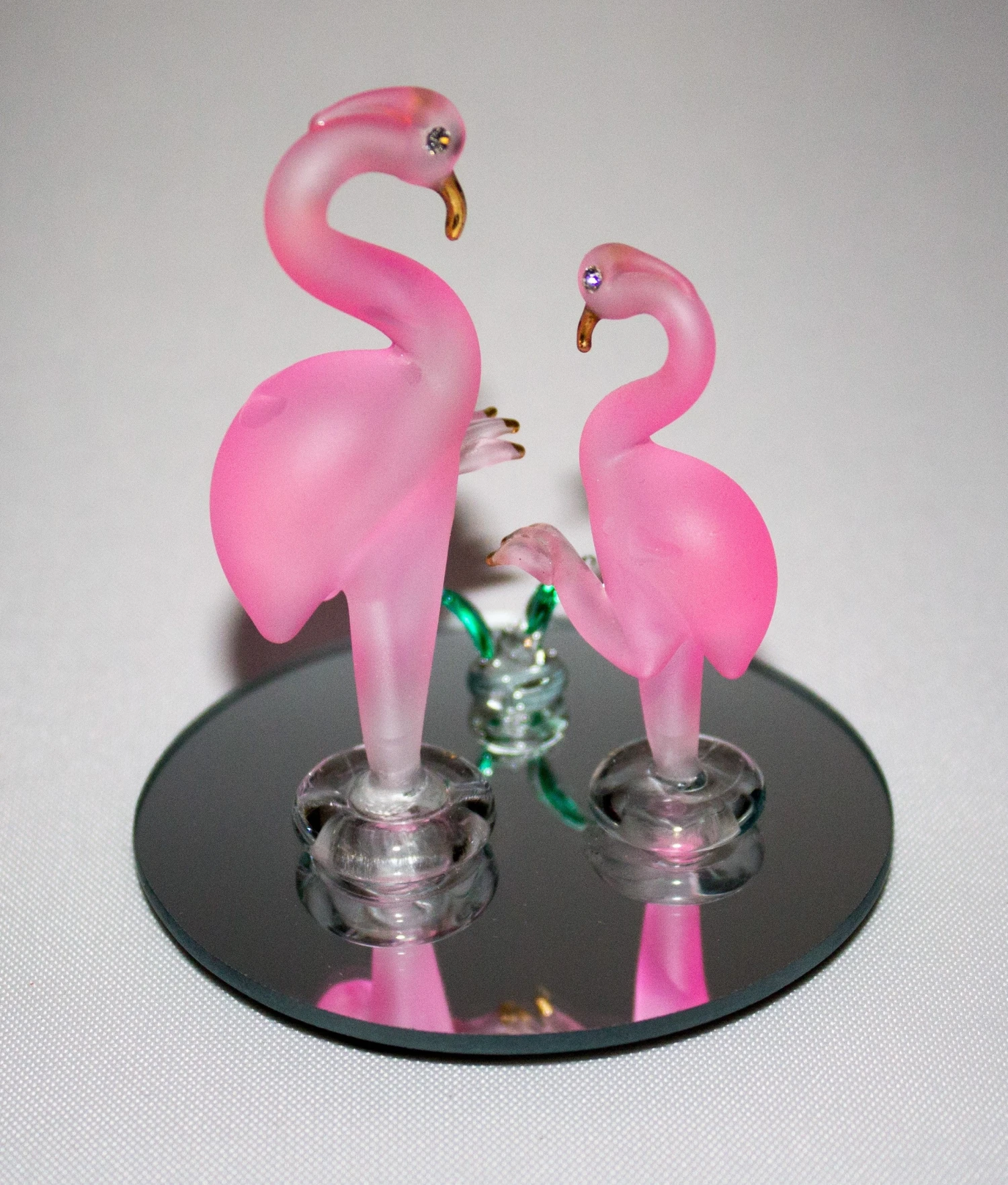 It’s a tropical adventure with these two handmade perfectly pink blown glass flamingos as they stand posed on the mirrored water. Handmade, blown glass, imported.