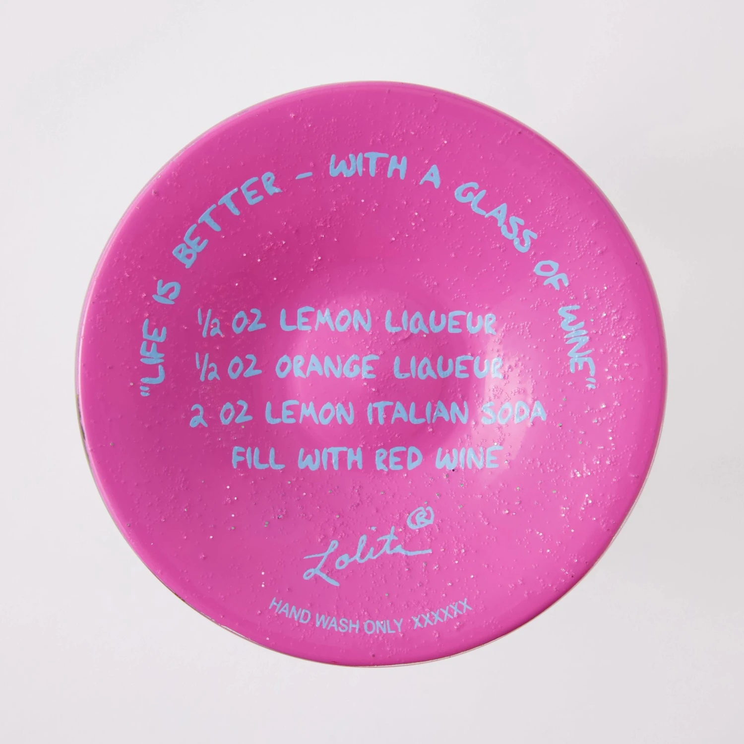 Celebrate the joy of wine with this vibrant Lolita wine glass, featuring bright pinks, purples, and greens, accented by sparkling grapes and shimmering gems. Fill up your cup and toast to the night, after all, life is better with a glass of wine.