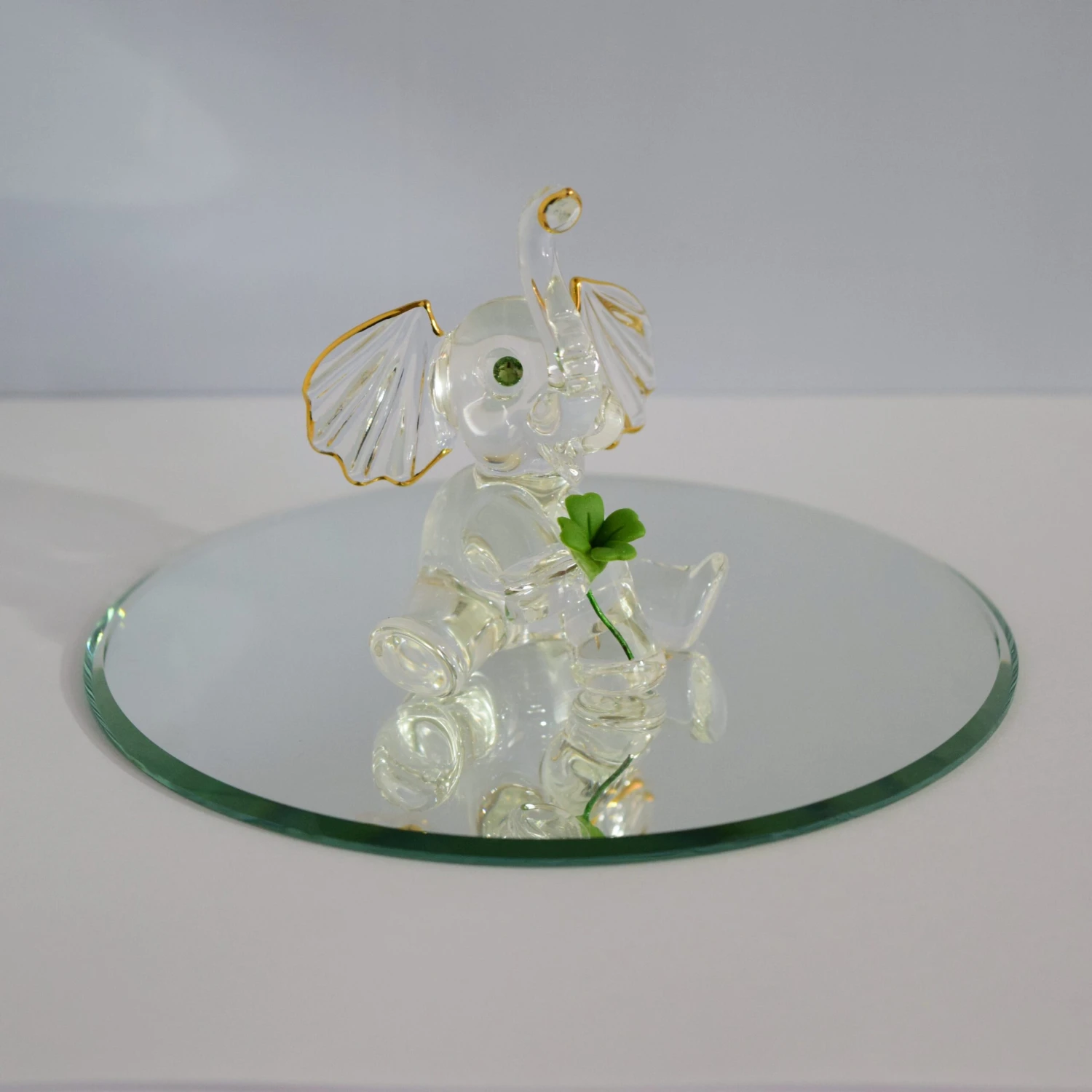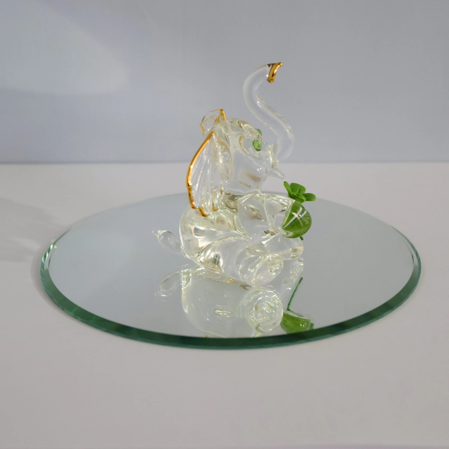 This piece is a lovely part of the Glass Blowers collection. With it’s green crystal eyes to it’s lovely green flower, this elephant is simply elegant. Perfect for any collection! (Mirror not included; sold separately)