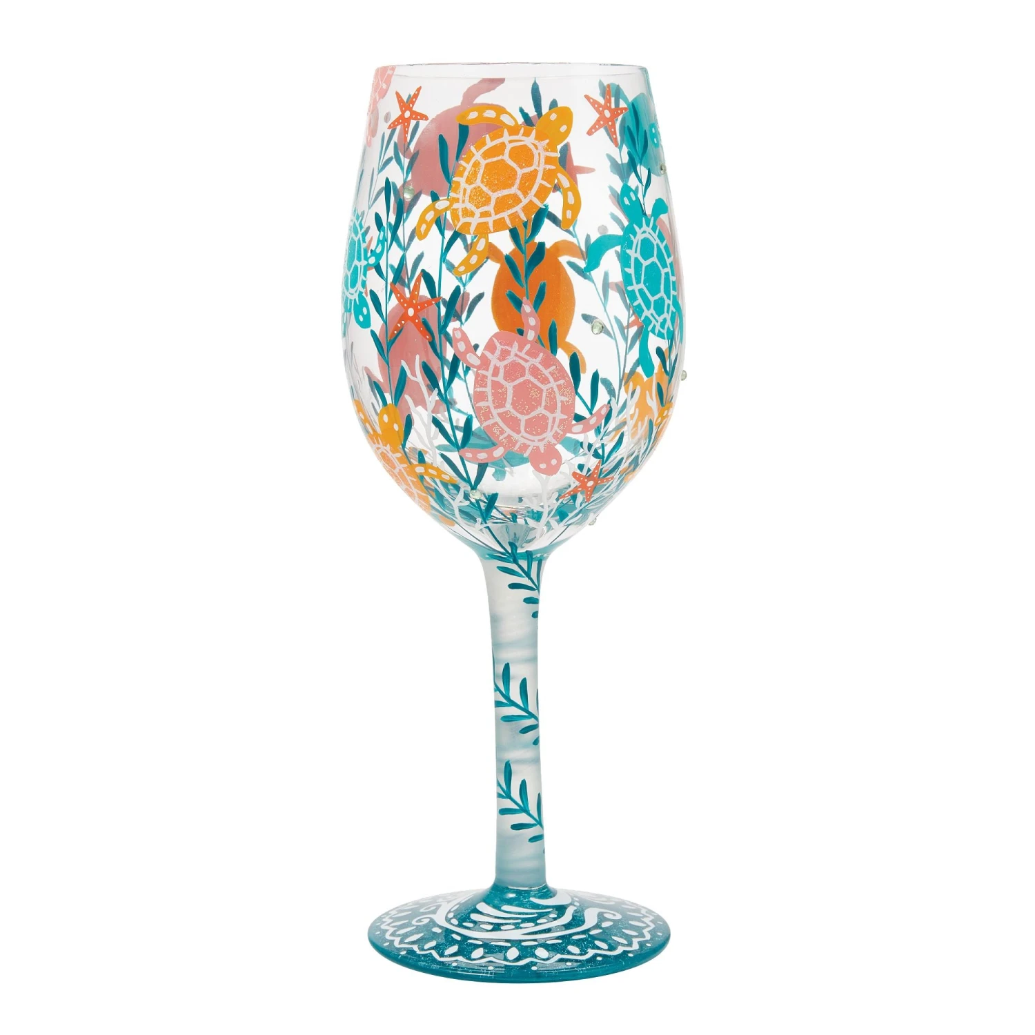 Dive into the enchanting sea depths with this colorful Lolita Designs wine glass, where seaweed, starfish, and ocean currents swirl in captivating hues. Encircling the cup, a band of pink, orange, and teal sea turtles add whimsy to your wine time.