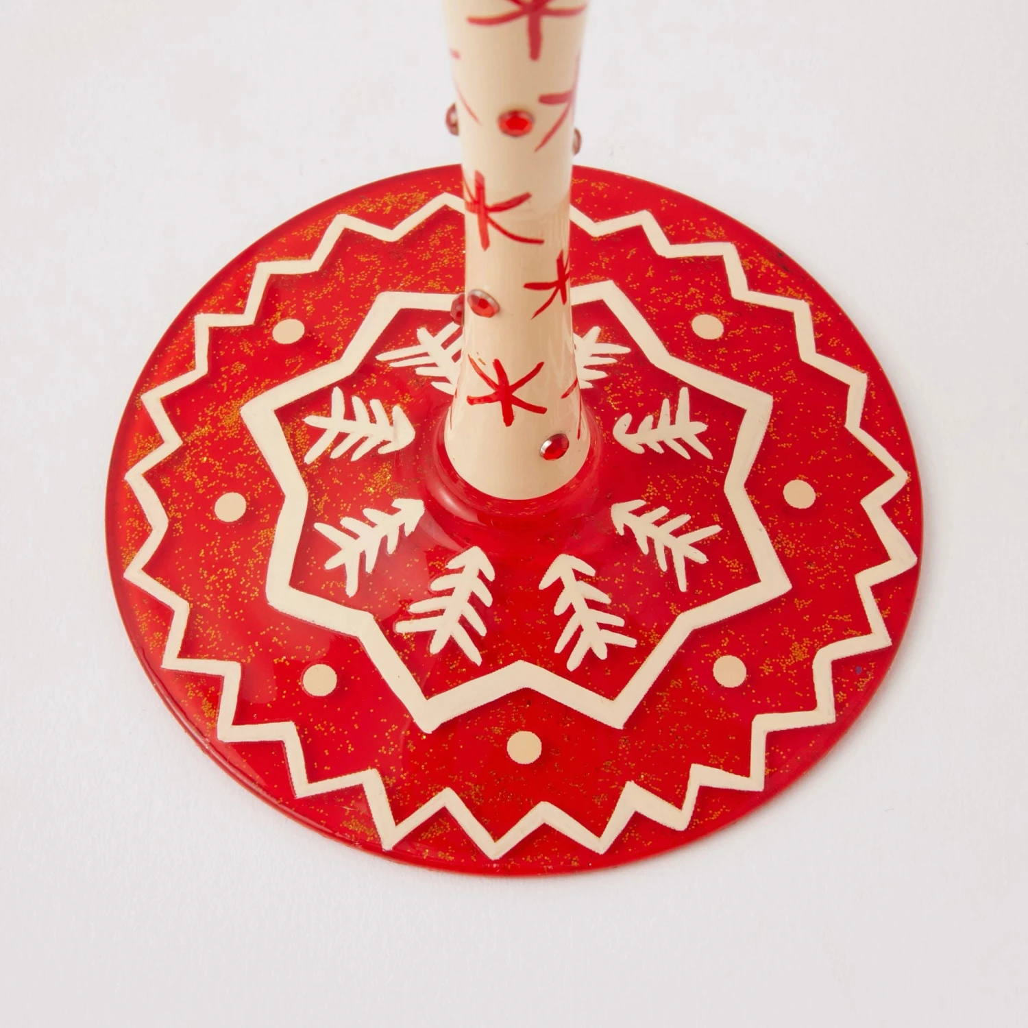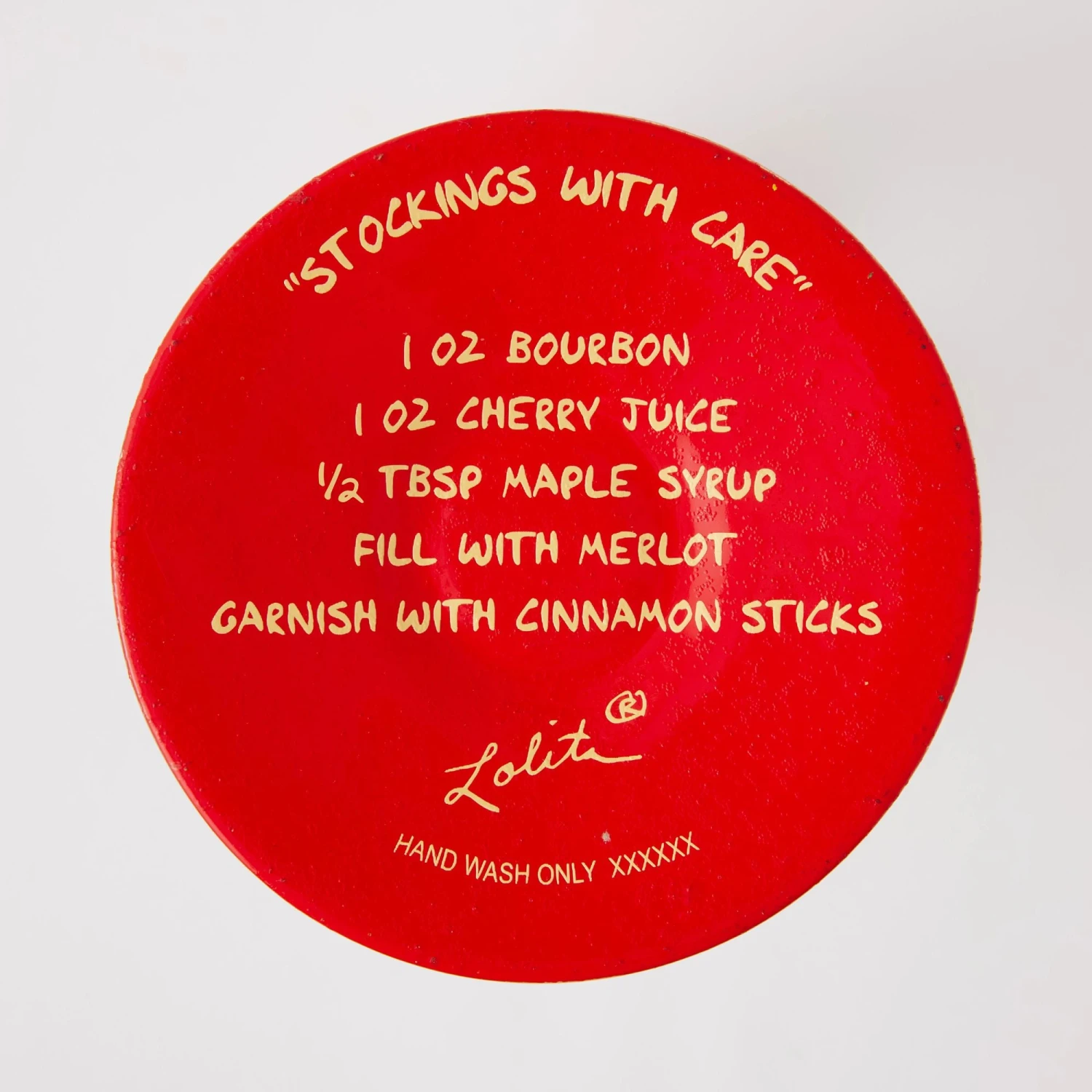 Celebrate the season with this festive Lolita wine glass, adorned with holly, snowflakes, and classic red and green holiday accents. Two stockings hang with care, brimming with presents to spread Christmas cheer with every sip!