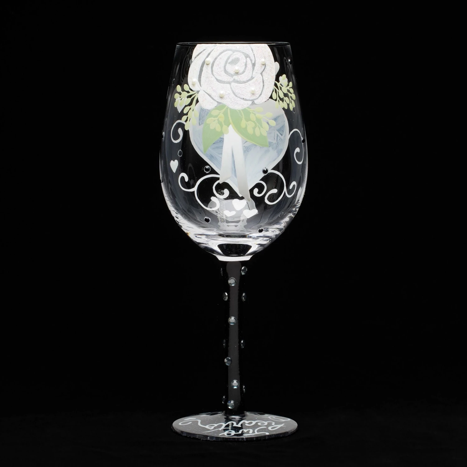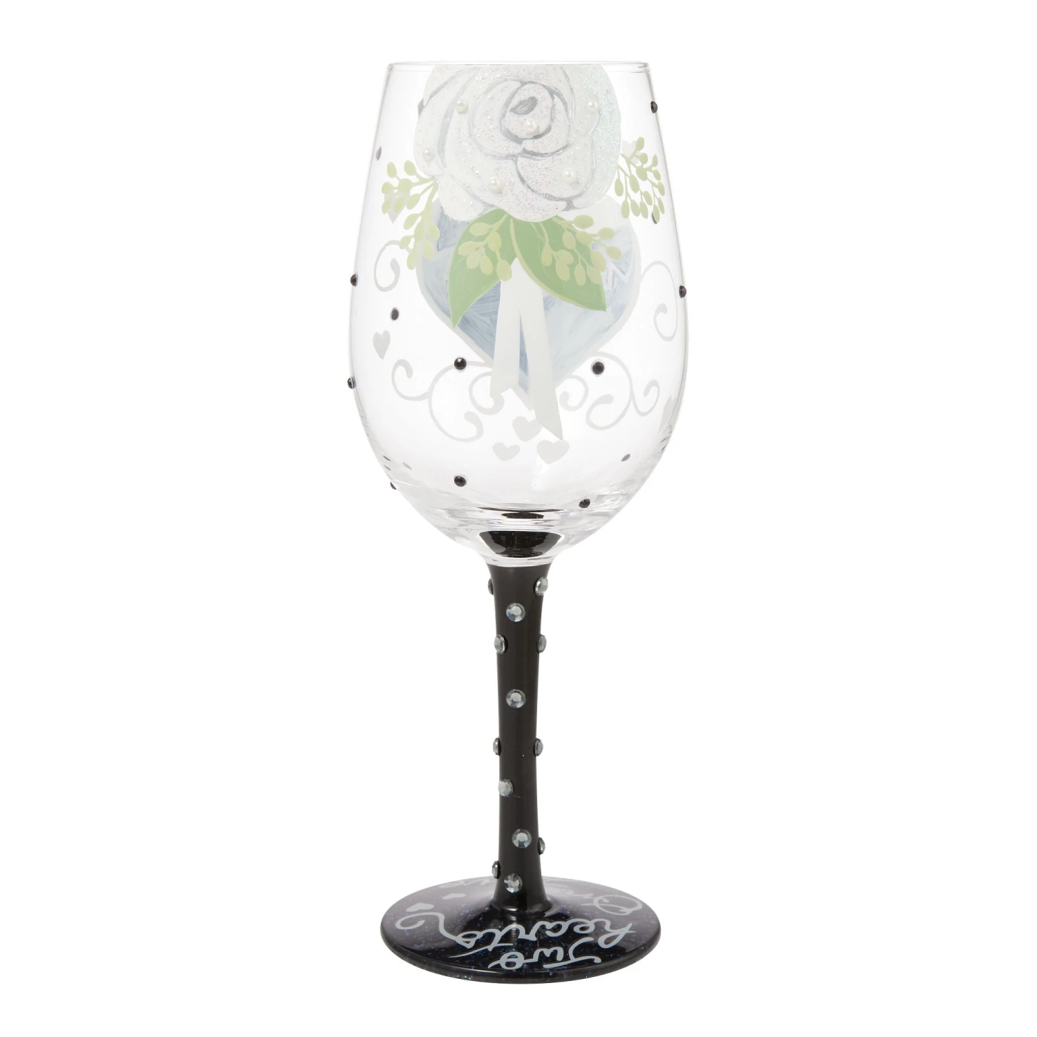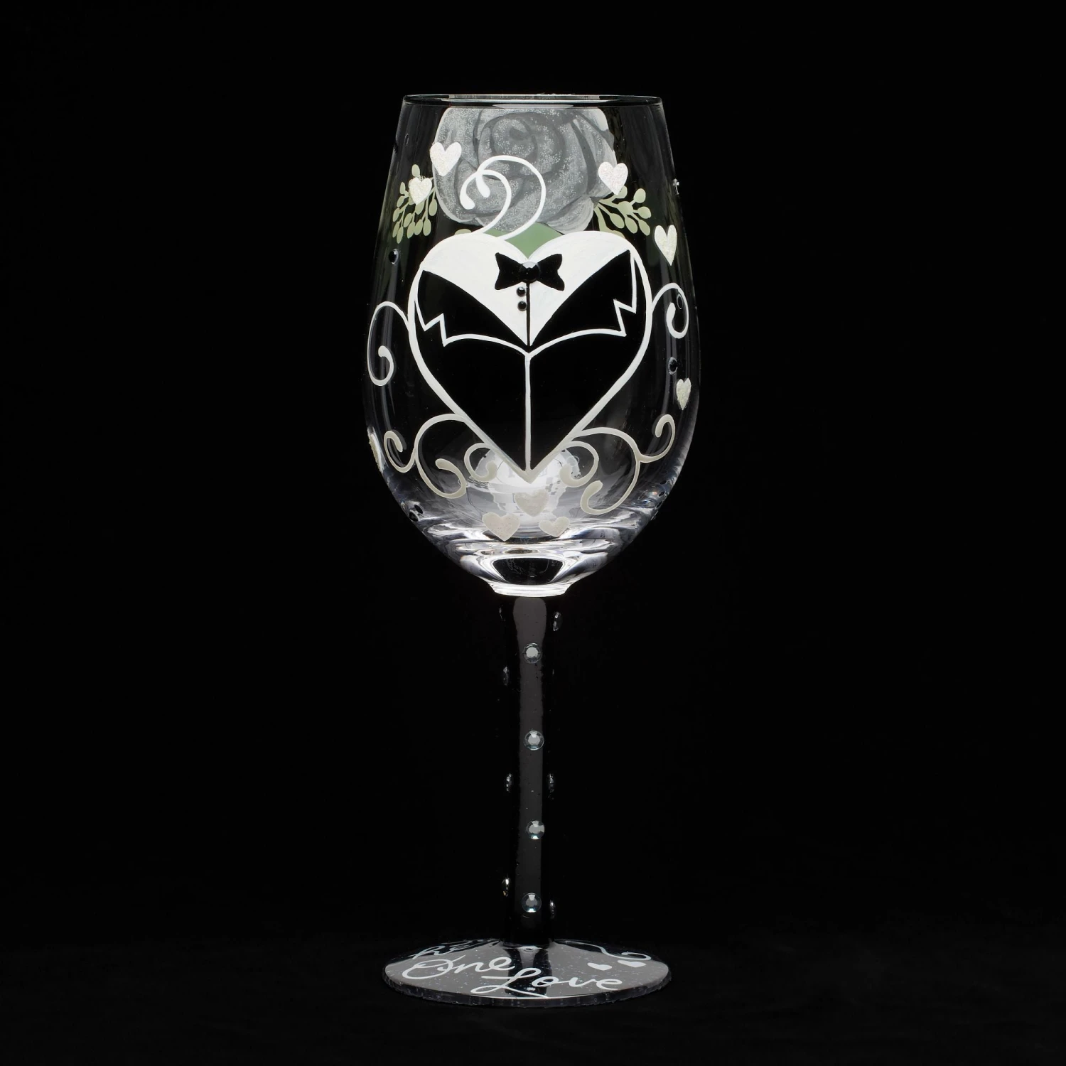Celebrate everlasting love with this romantic hand-painted wine glass from Lolita, inspired by the dashing groom. Adorned with charming white hearts, swirls, and a sophisticated tuxedo with a bow tie, this glass is a perfect for cheers to forever!