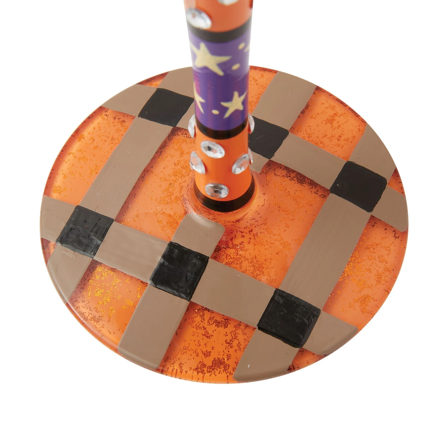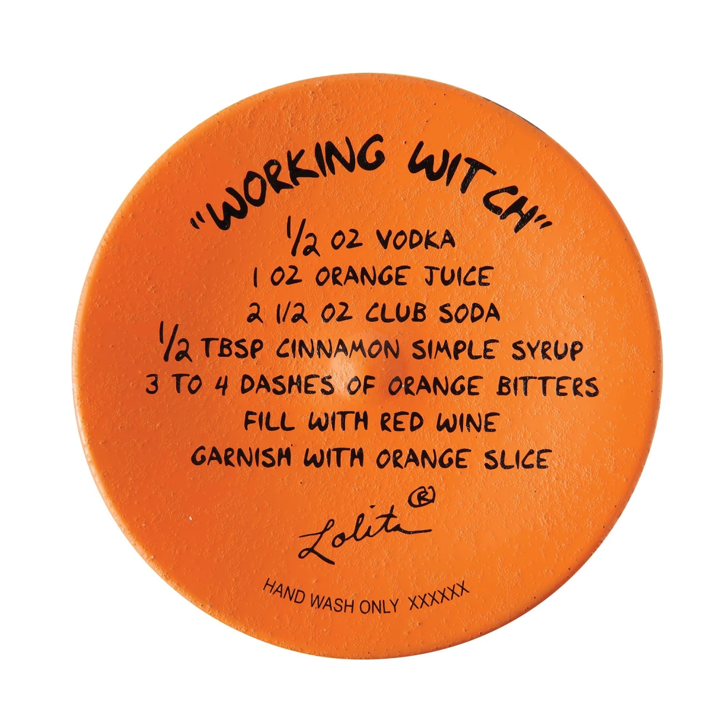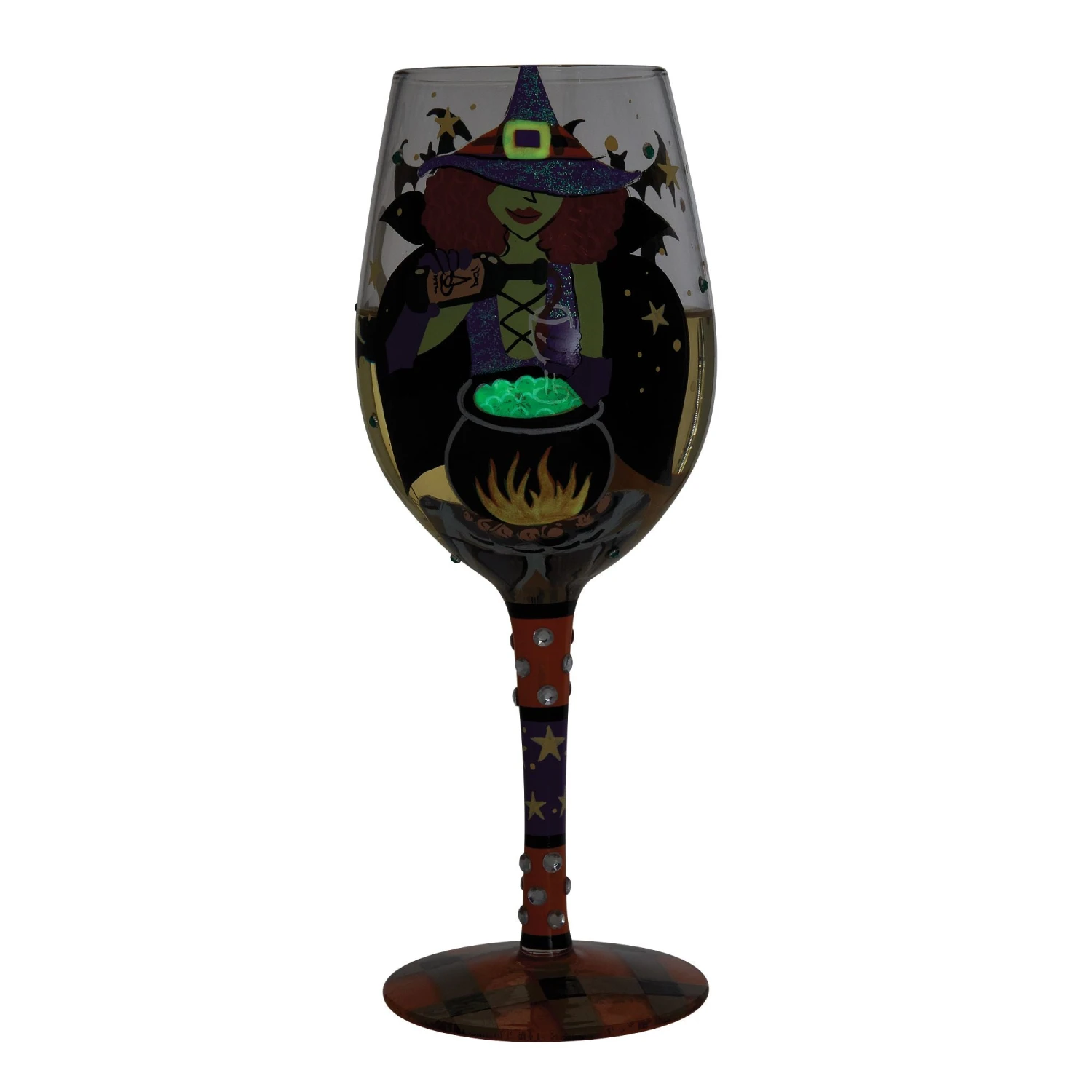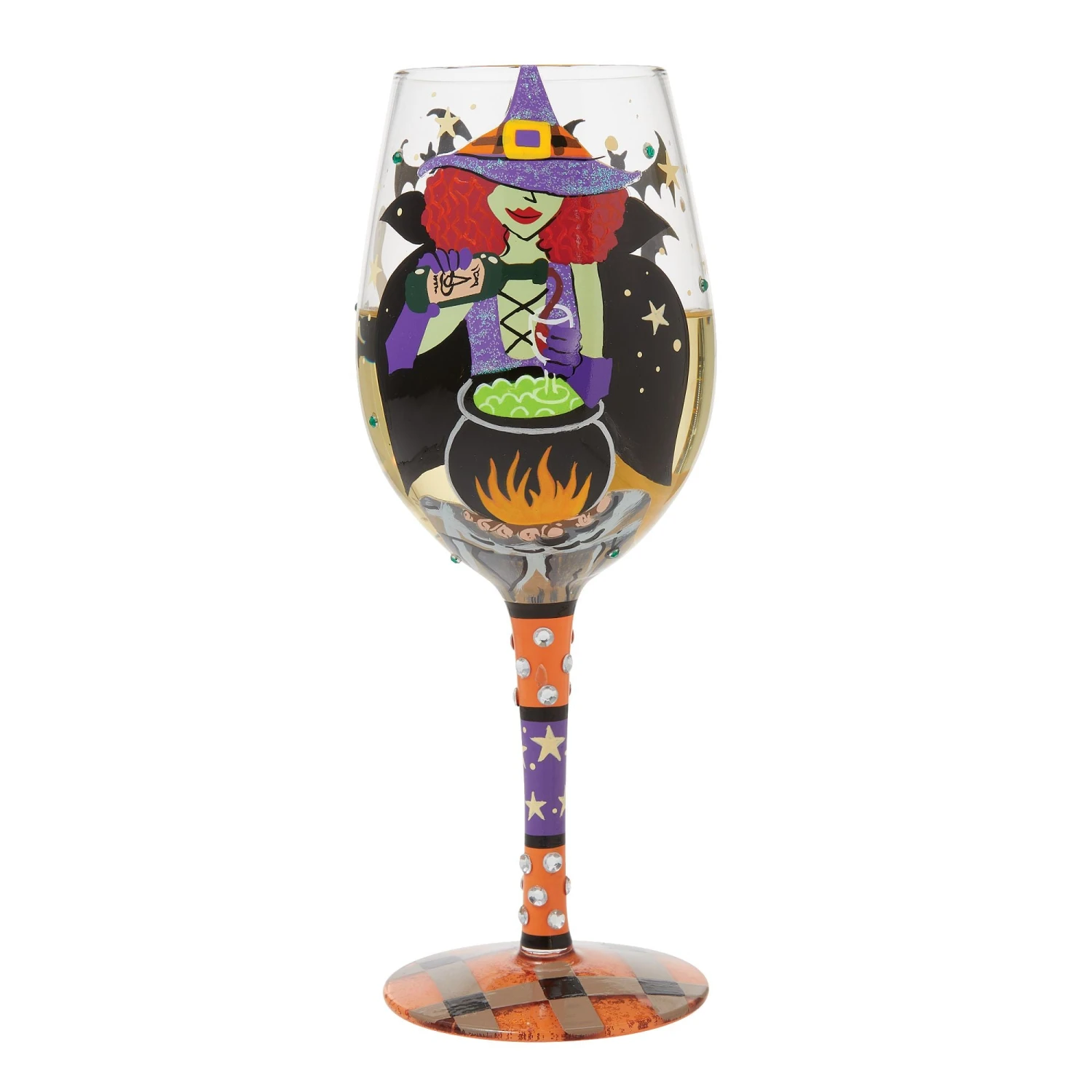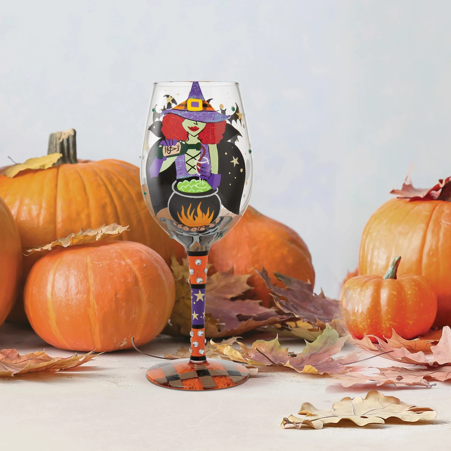 This enchanting Halloween wine glass from Lolita features a Working Witch brewing potions over a bubbling cauldron. Ghosts and bats fly across the glass with vibrant orange and purple hues, inlaid rhinestones, and mesmerizing glow-in-the-dark paint.